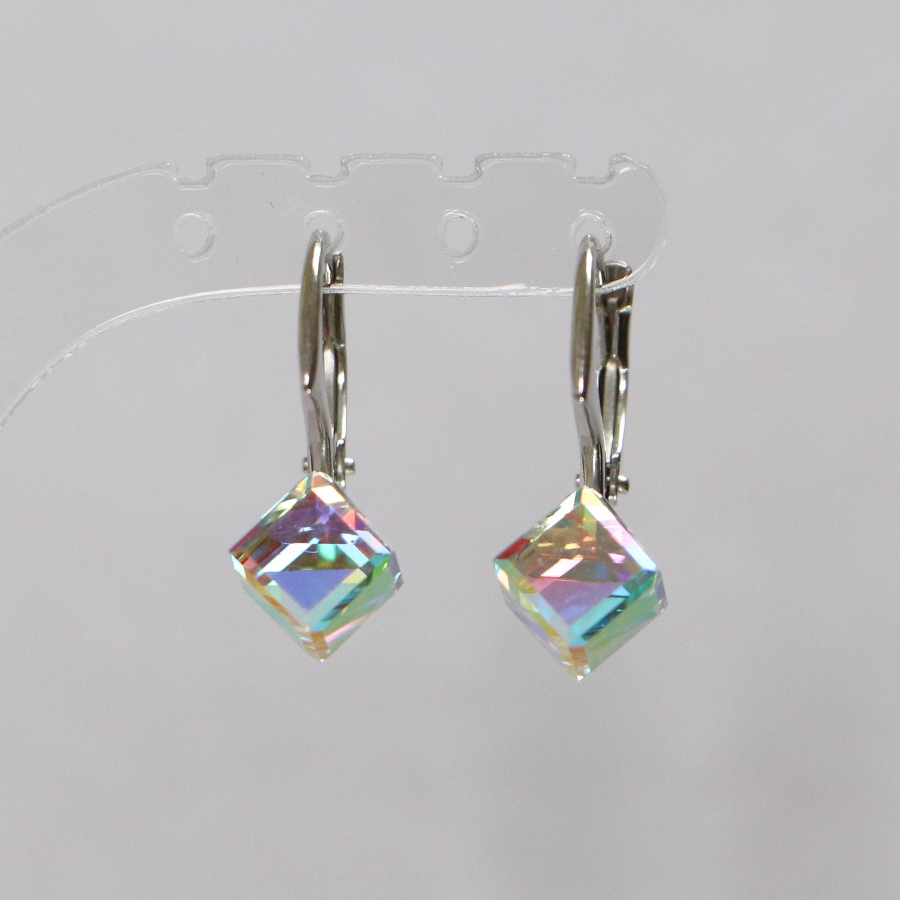 Boucles d'oreilles, cristaux Swarovski, argent rhodié, cristal AB, CUBIC