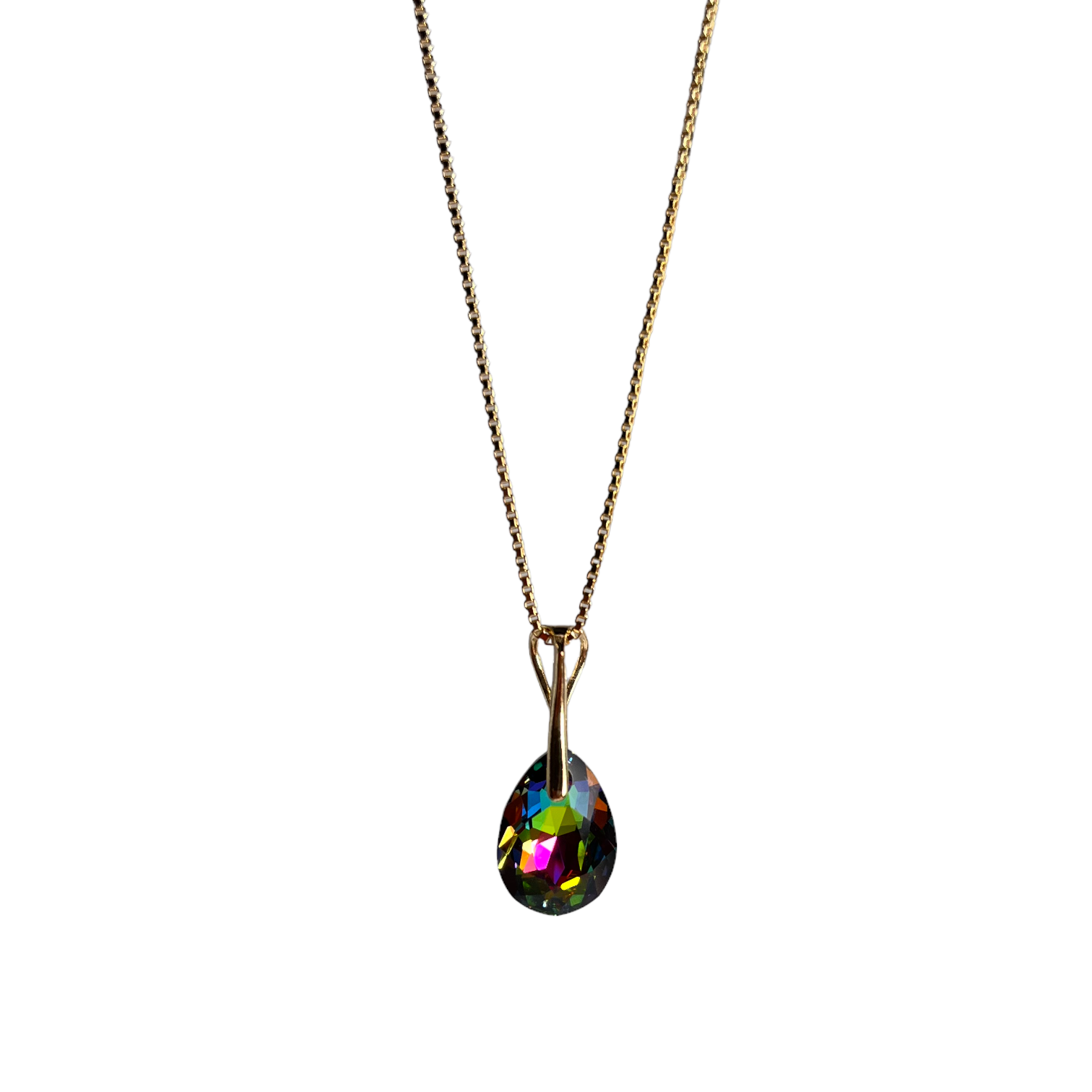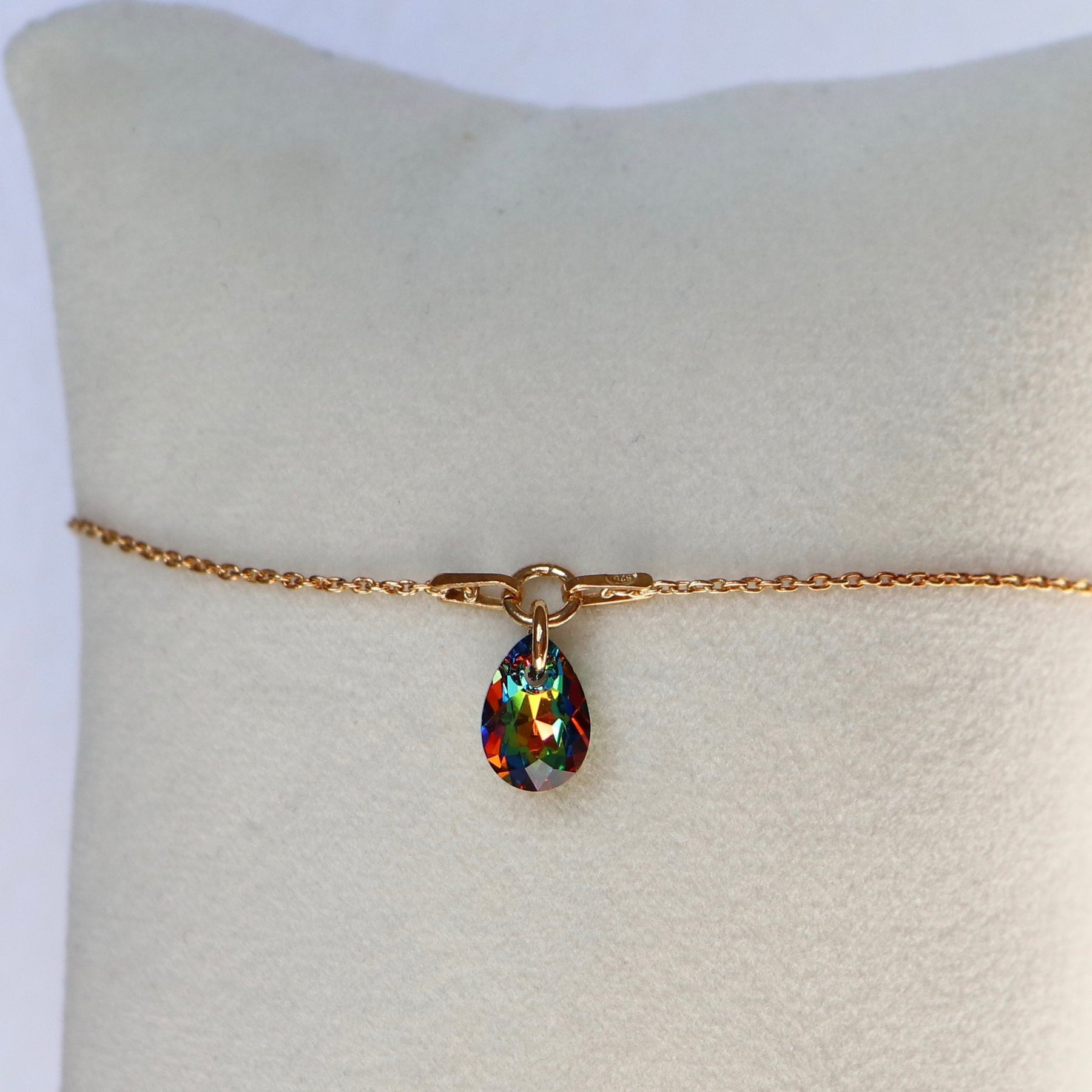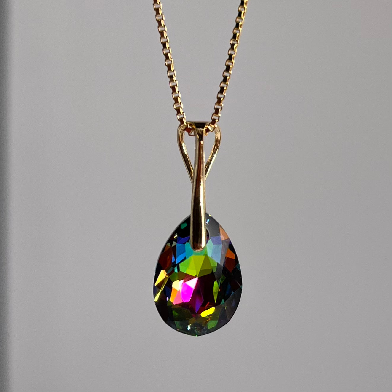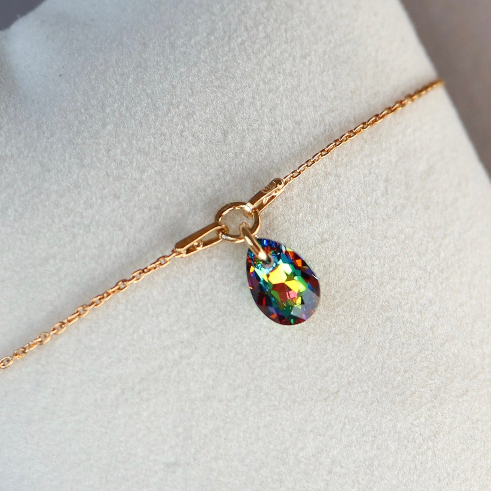 Longueur de pendentif est de 28 mm, chaine de 40+5 cm. Taille de cristal est de 16X10 mm.