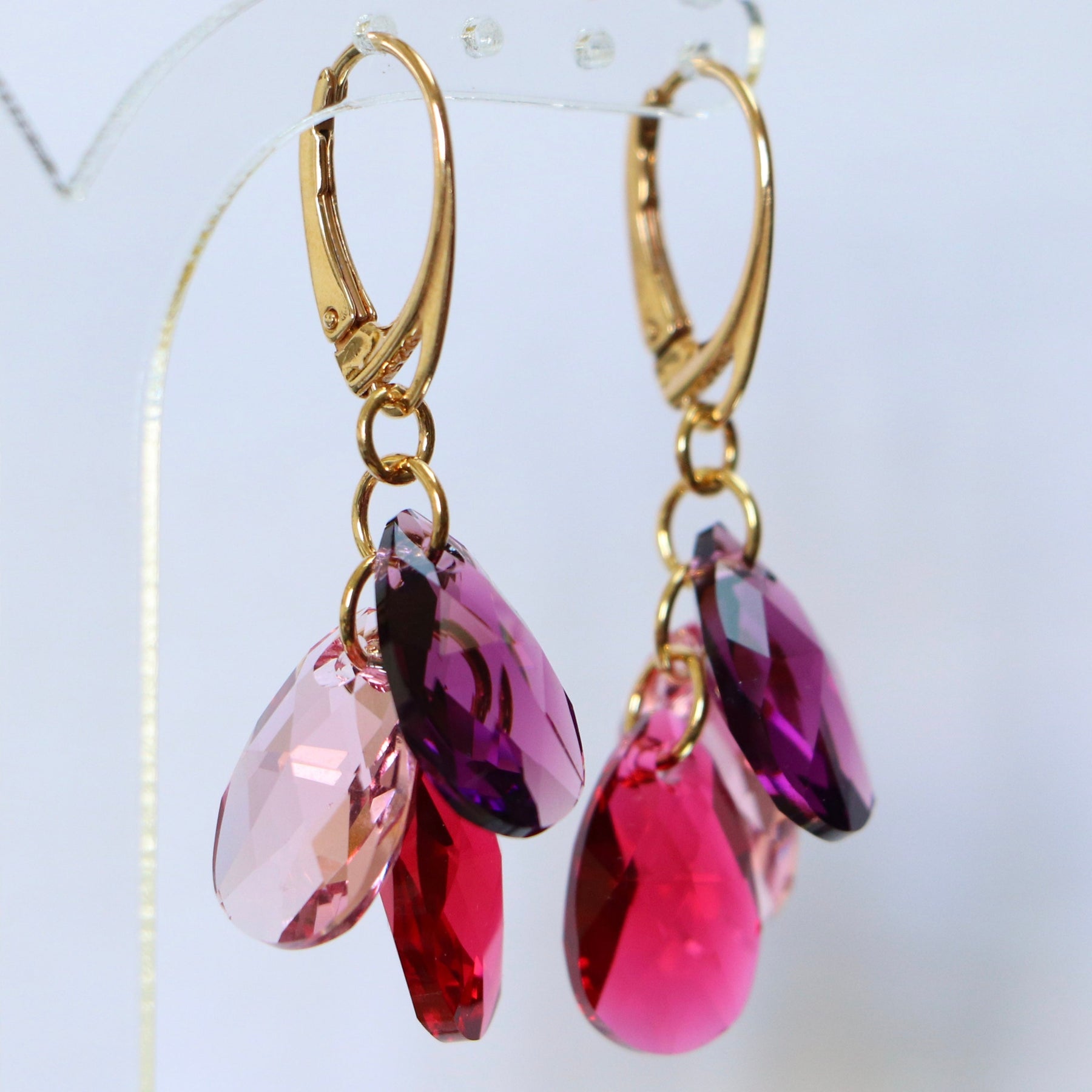 Longueur d'une e boucle d’oreille est de 46 mm (dormeuse 17 mm + 29 mm partie pendante), elle contient trois cristaux Swarovski (16 mm x 9 mm).