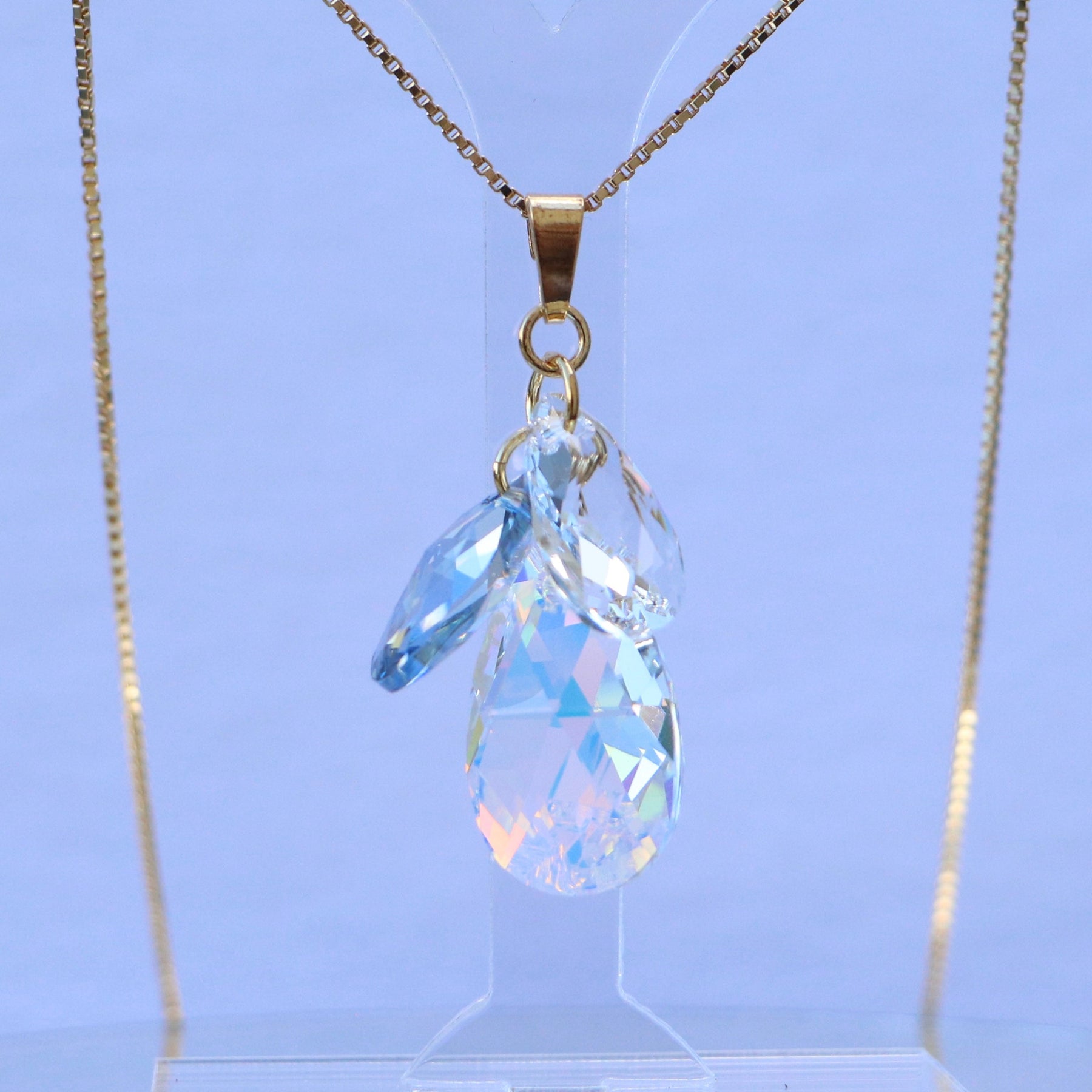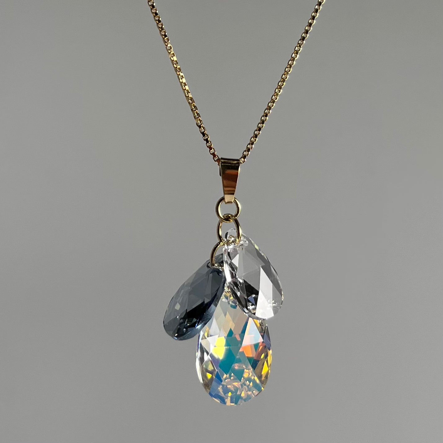 Longueur de pendentif est de 4 cm, il contient trois cristaux Swarovski (22x14 mm et 16x9 mm), chaine de 40+5 cm.
