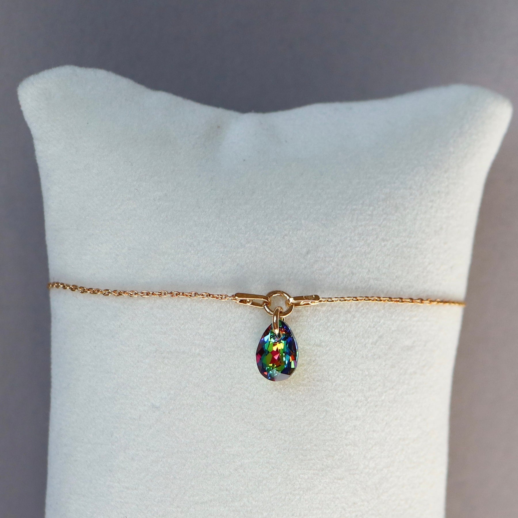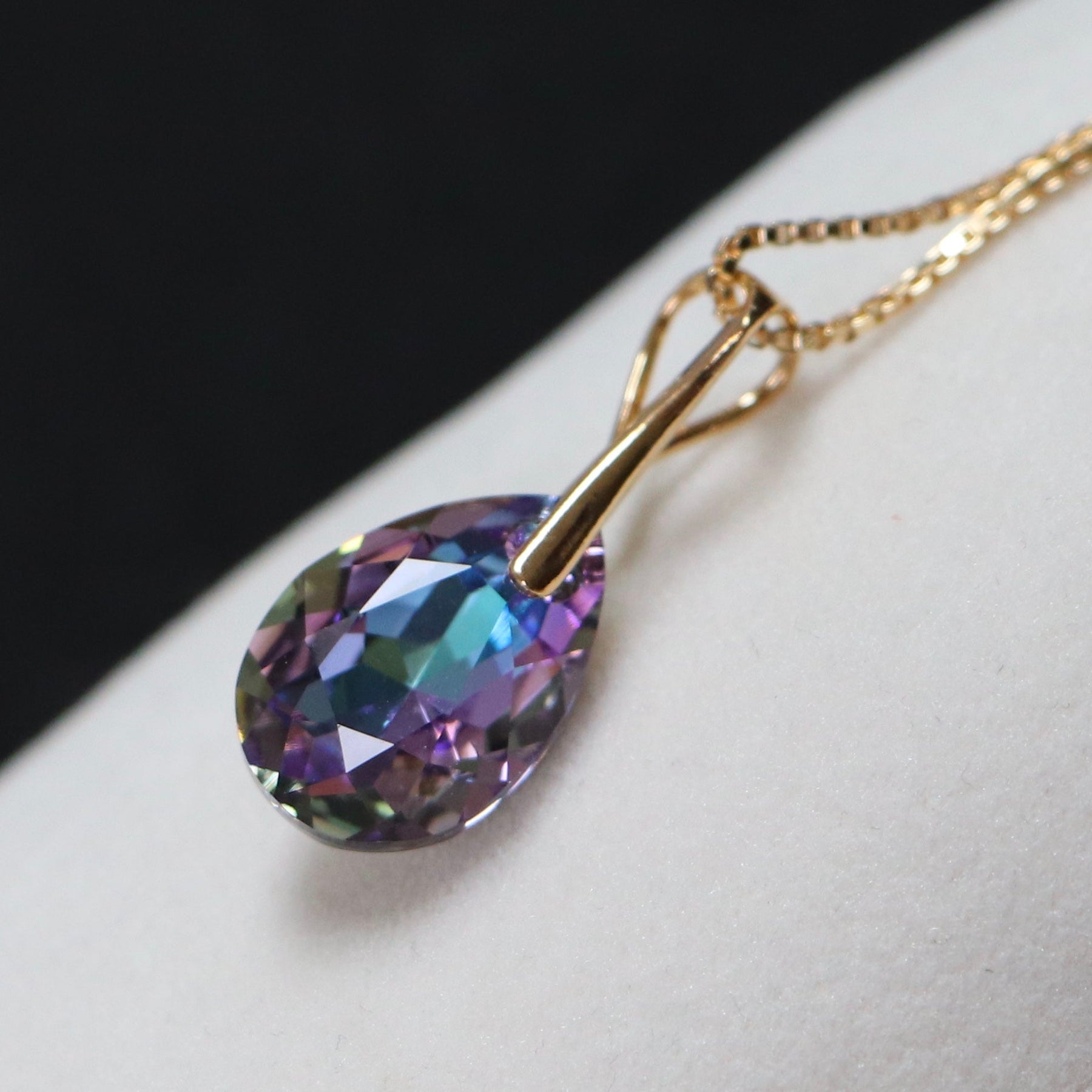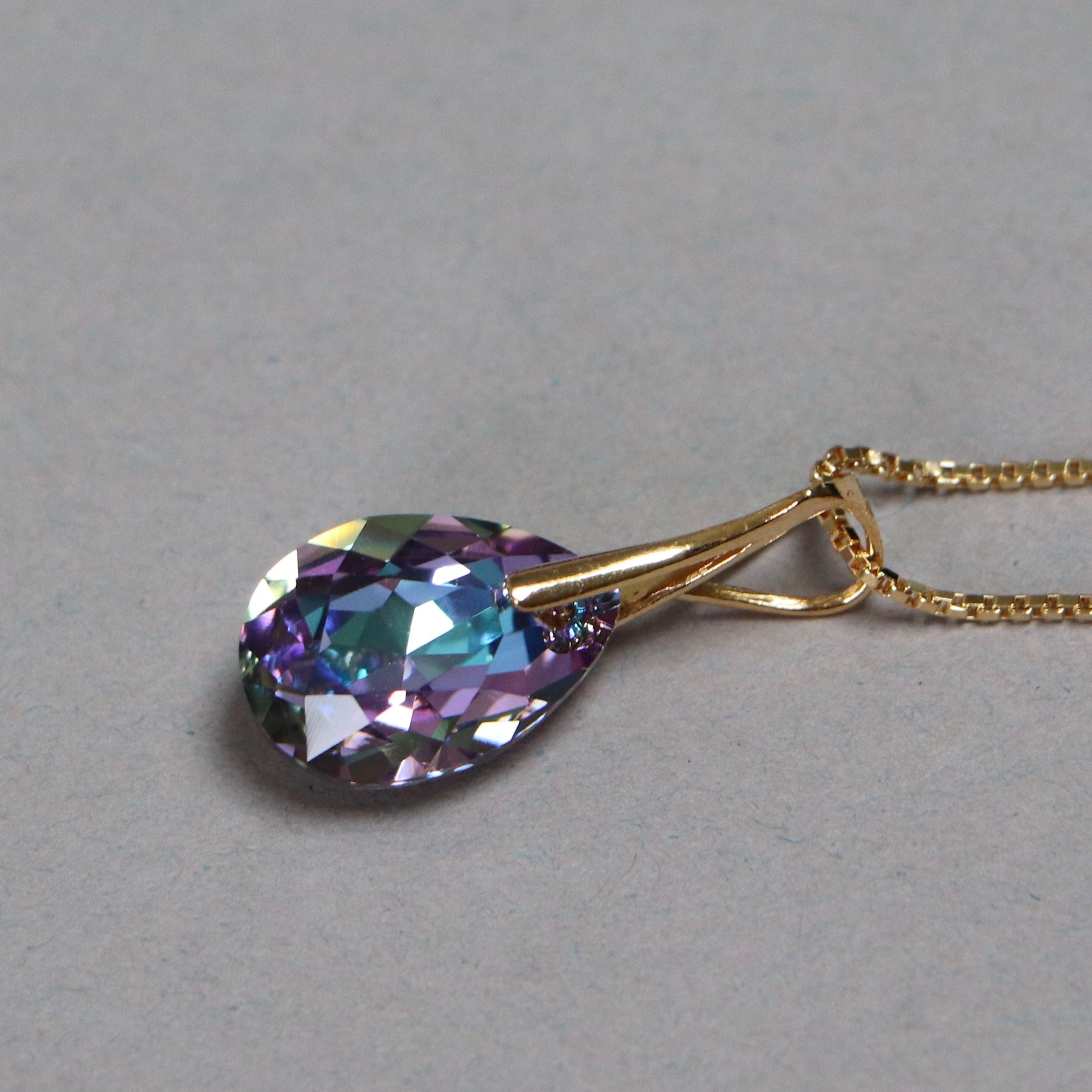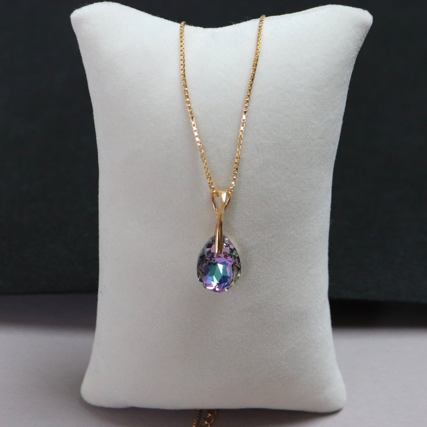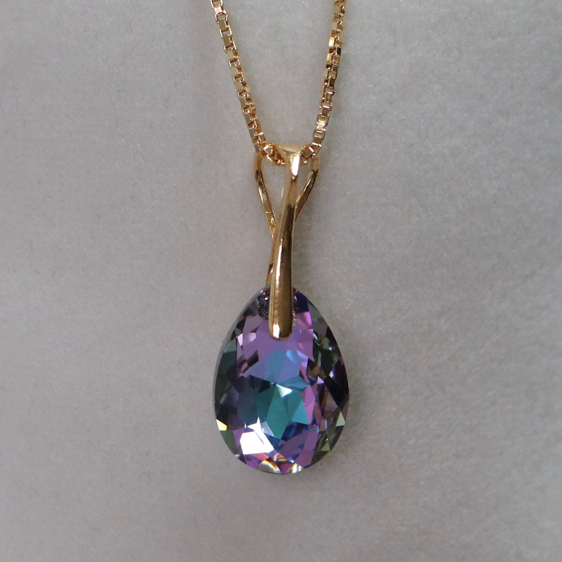 Longueur de pendentif est de 28 mm, chaine de 40+5 cm. Taille de cristal est de 16X10 mm.