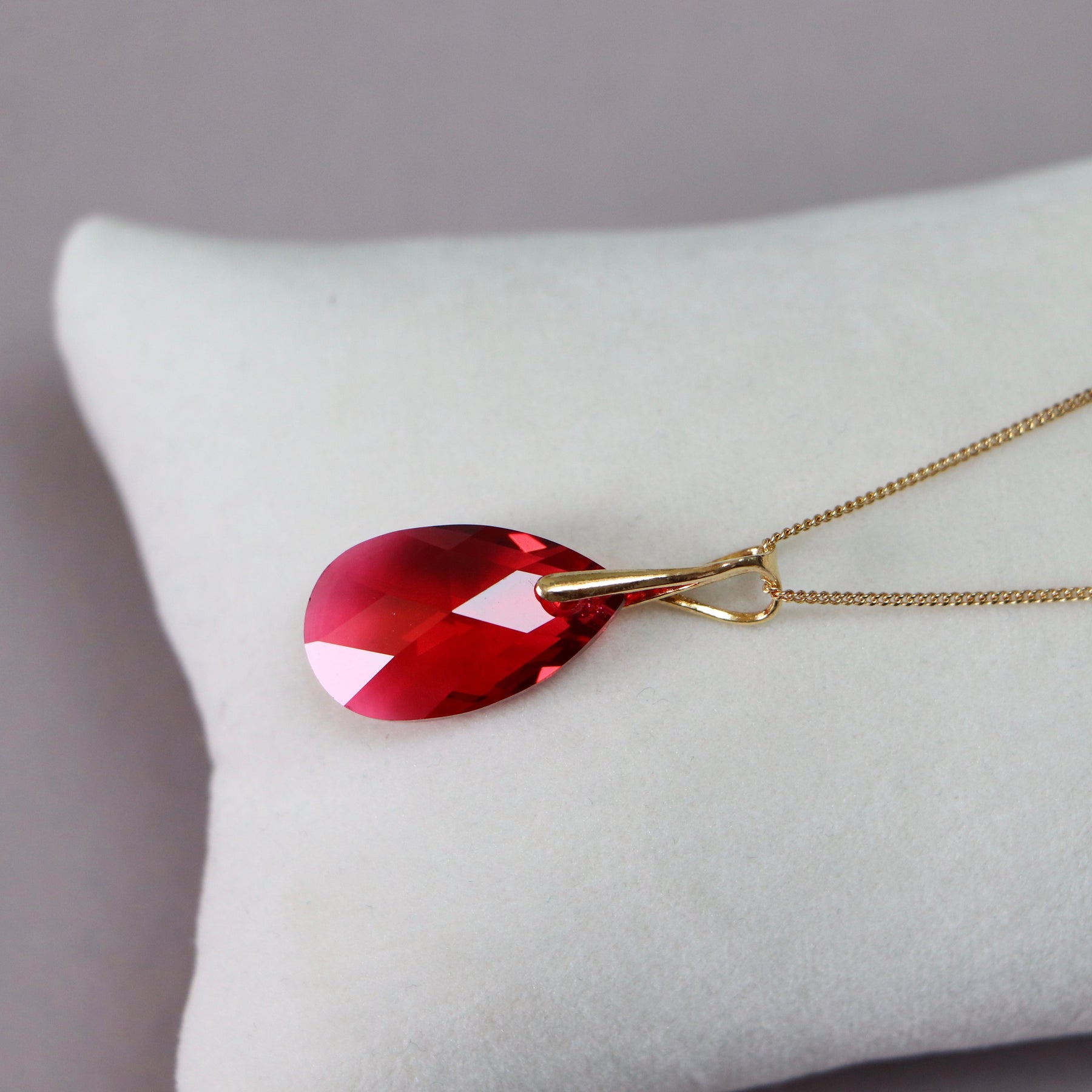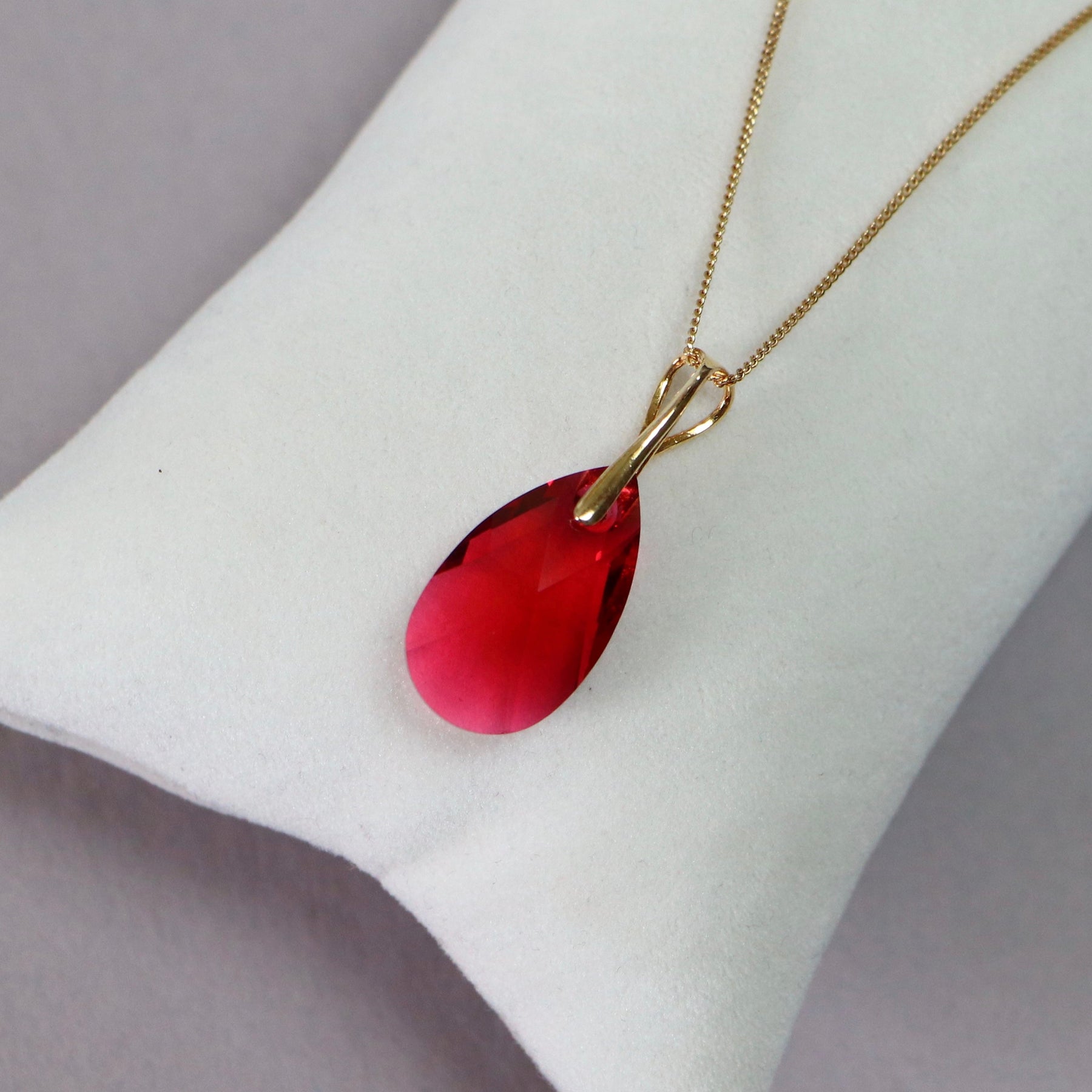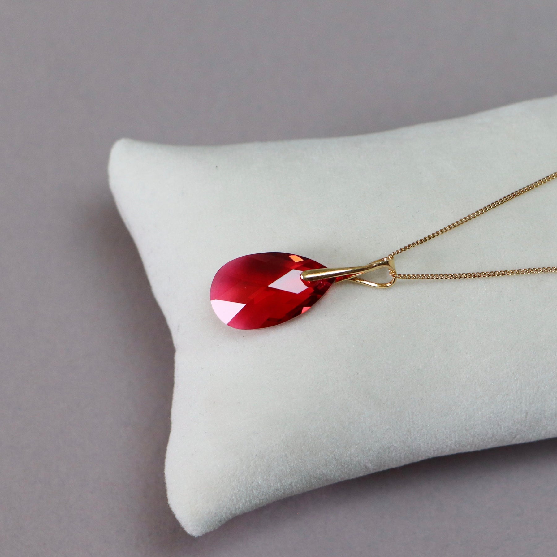 Pendentif (grande goutte) avec ou sans chaine, cristaux Swarovski, argent doré, collection LARME, rouge framboise