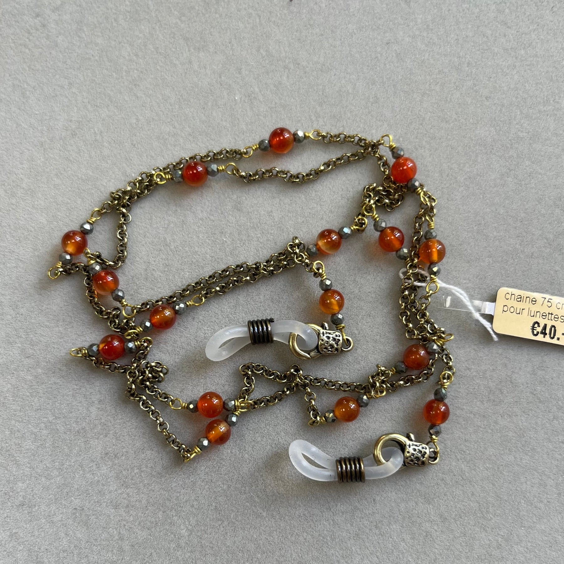 Brillen- und Sonnenbrillenkette aus Messing mit Natursteinen, 75 cm, Karneol und Hämatit