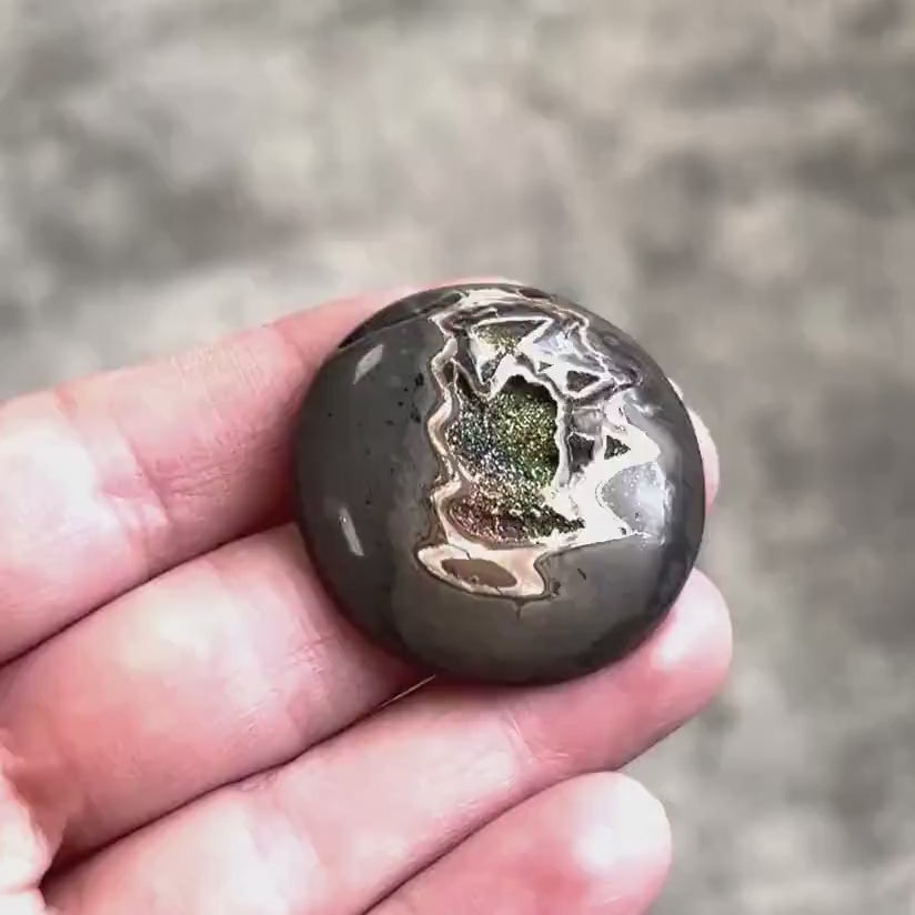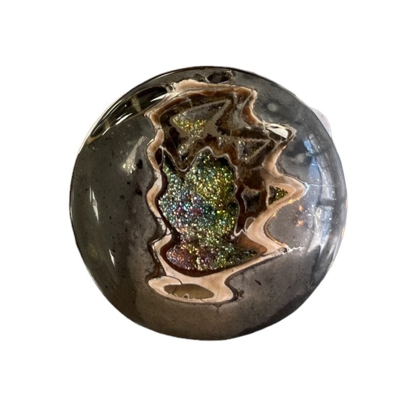 Cabochon in pyritisiertem Ammoniten, Geode, Pseudomorphose, Fossil.