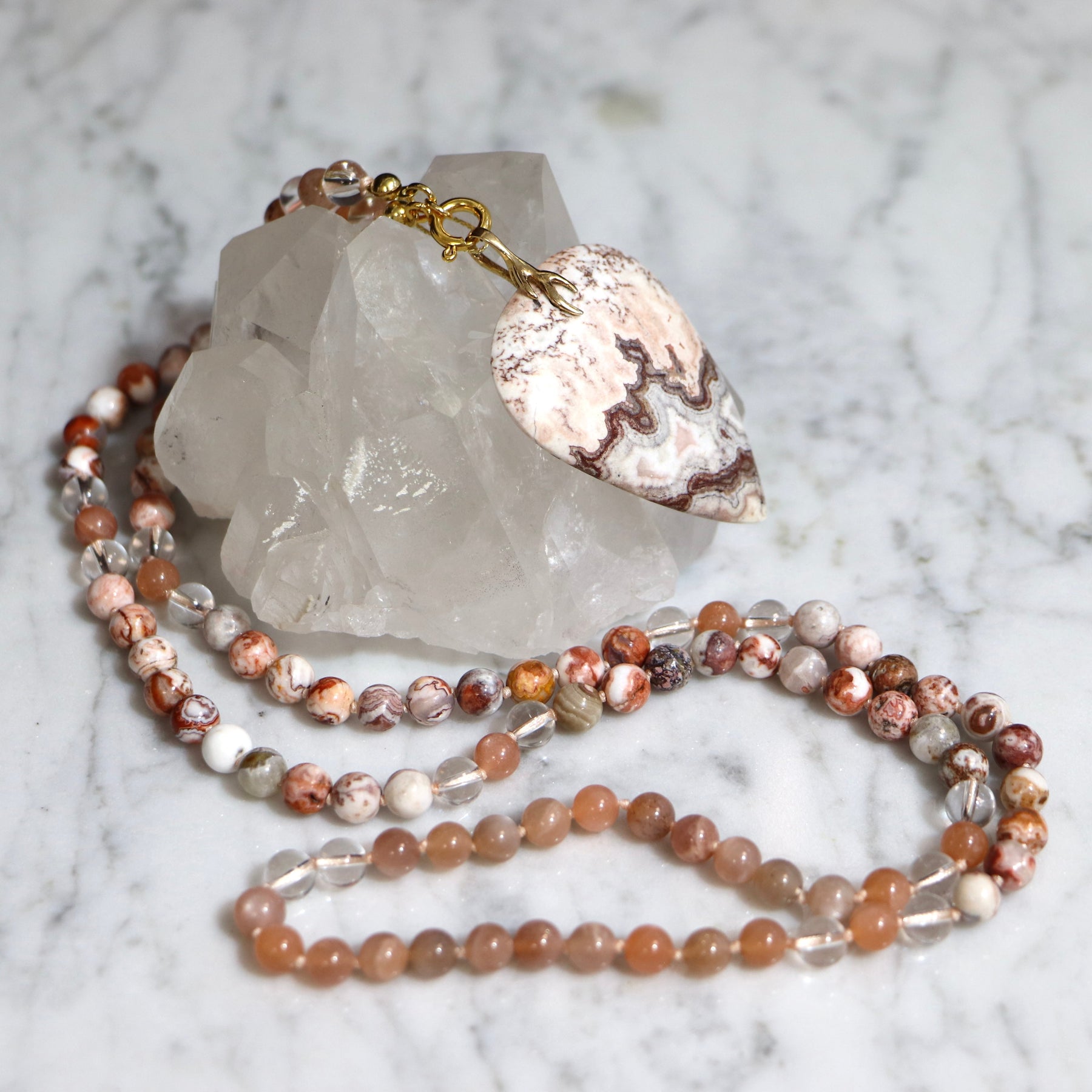 Mala-Halskette aus Achat und Mondstein mit einem Anhänger aus Achat in „Crazy Lace“-Optik