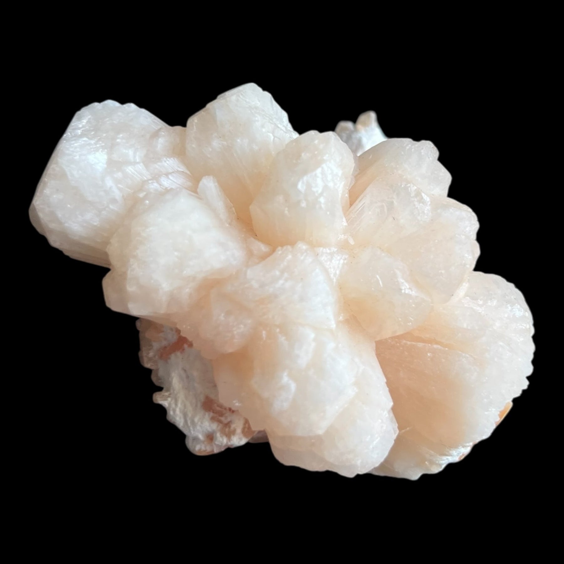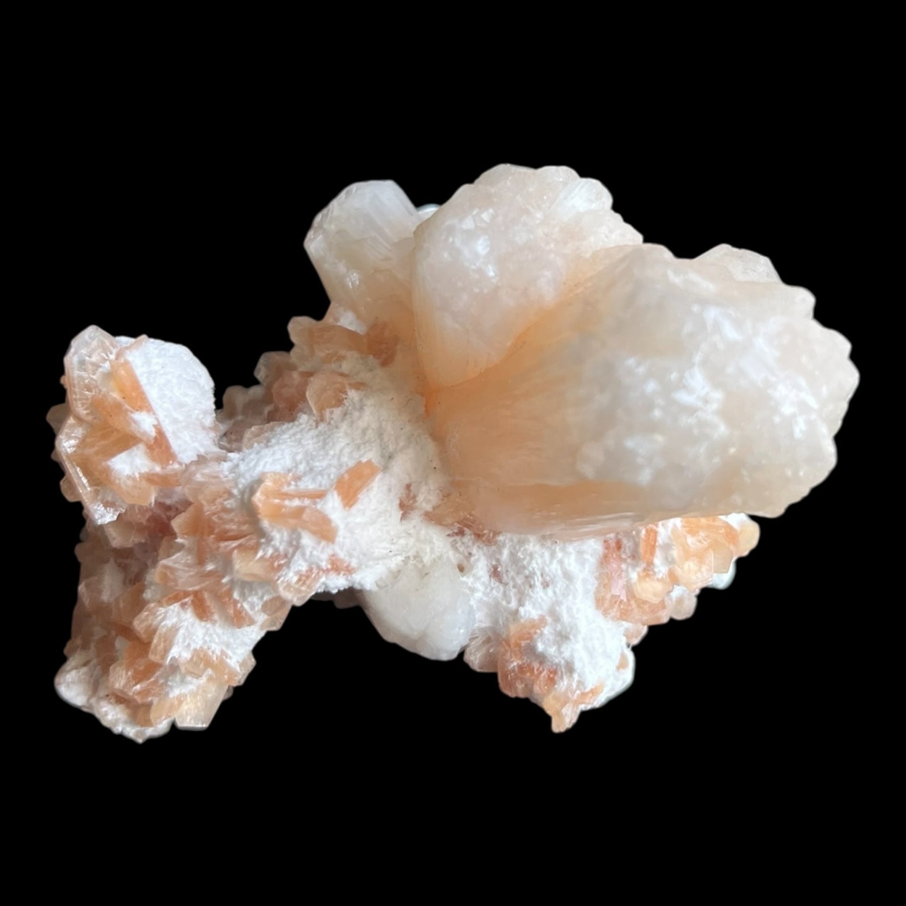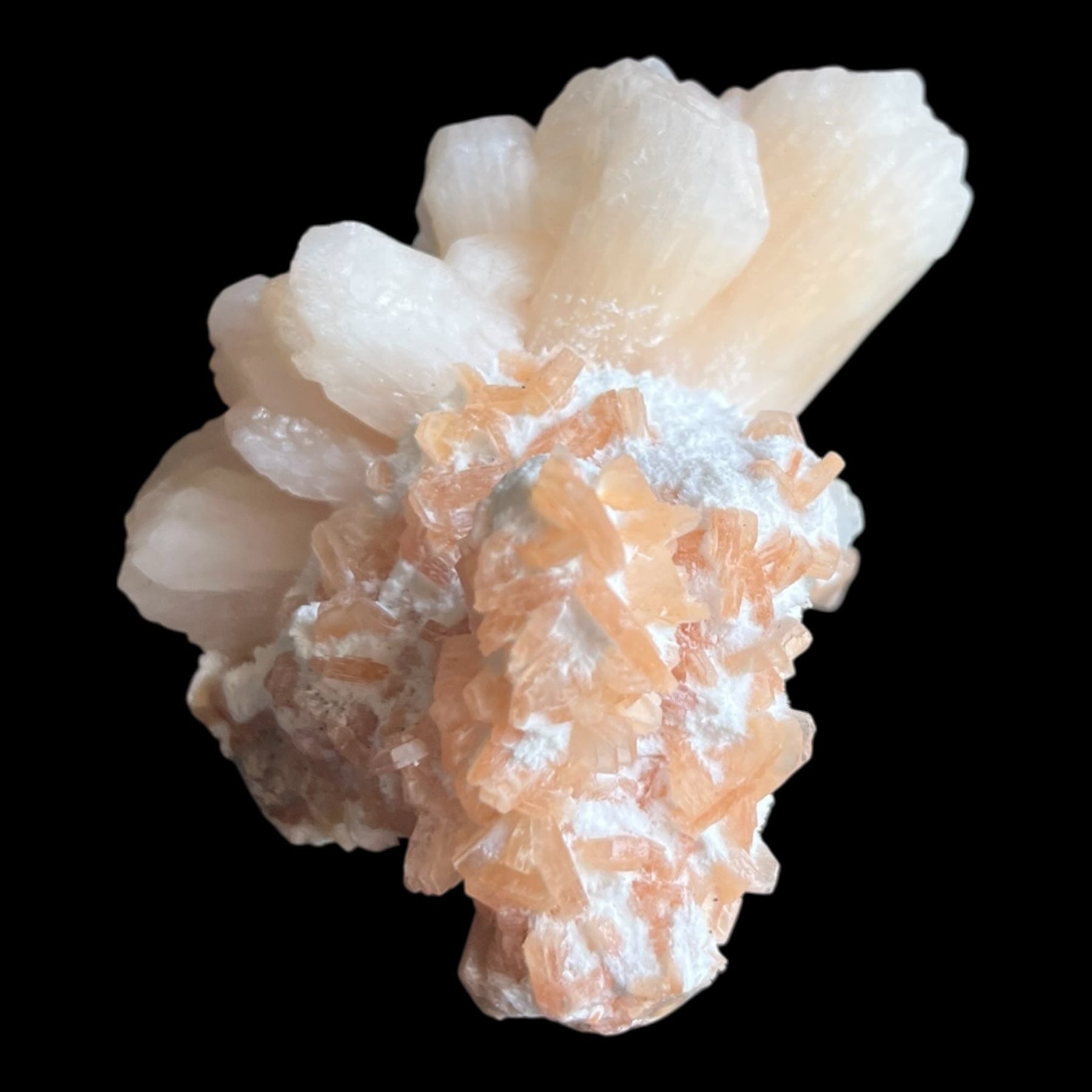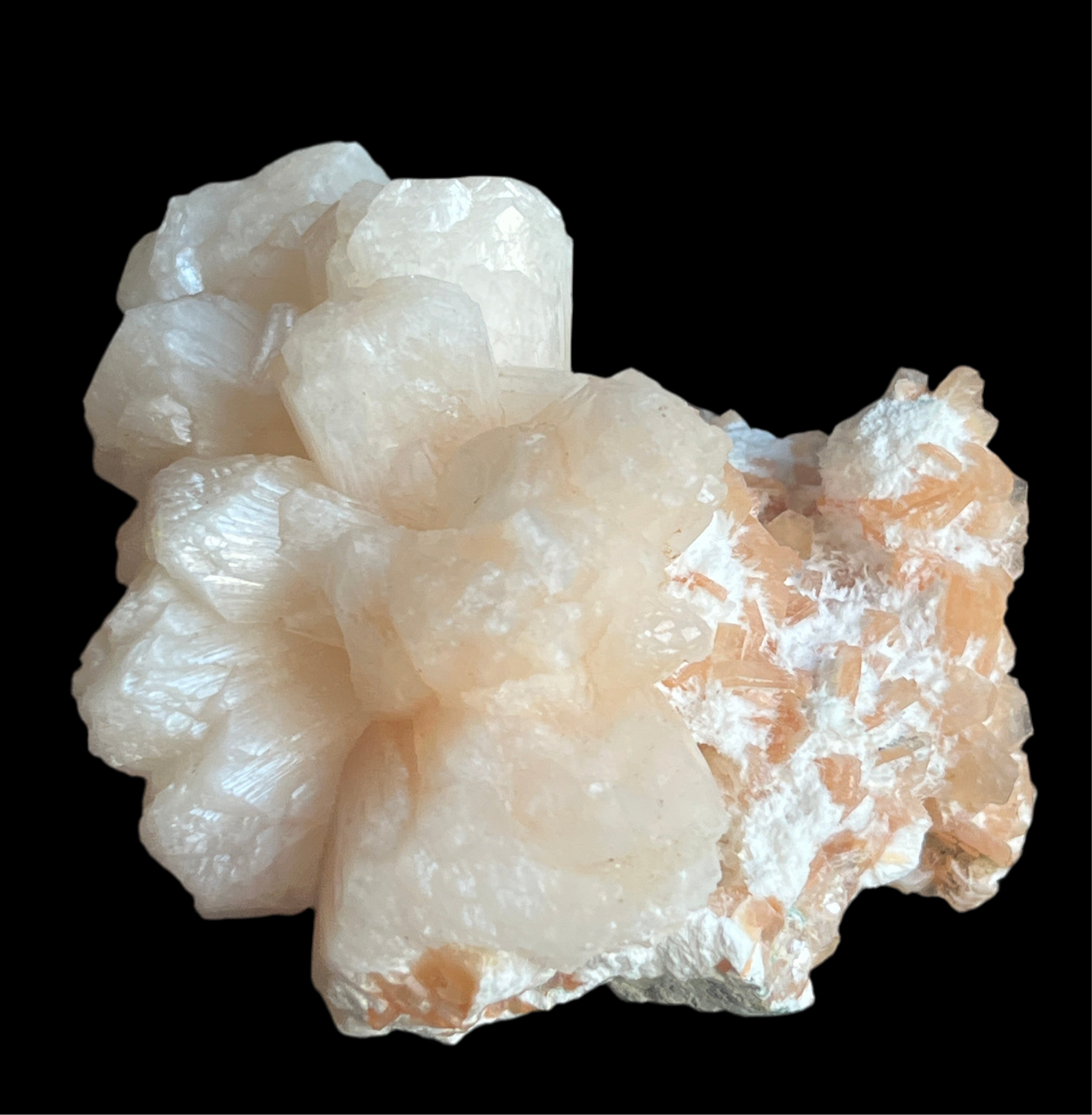 Ästhetisches Objekt, bestehend aus Stellerit auf der einen und Heulandit auf der anderen Seite, auf einer weißen Mordenitmatrix