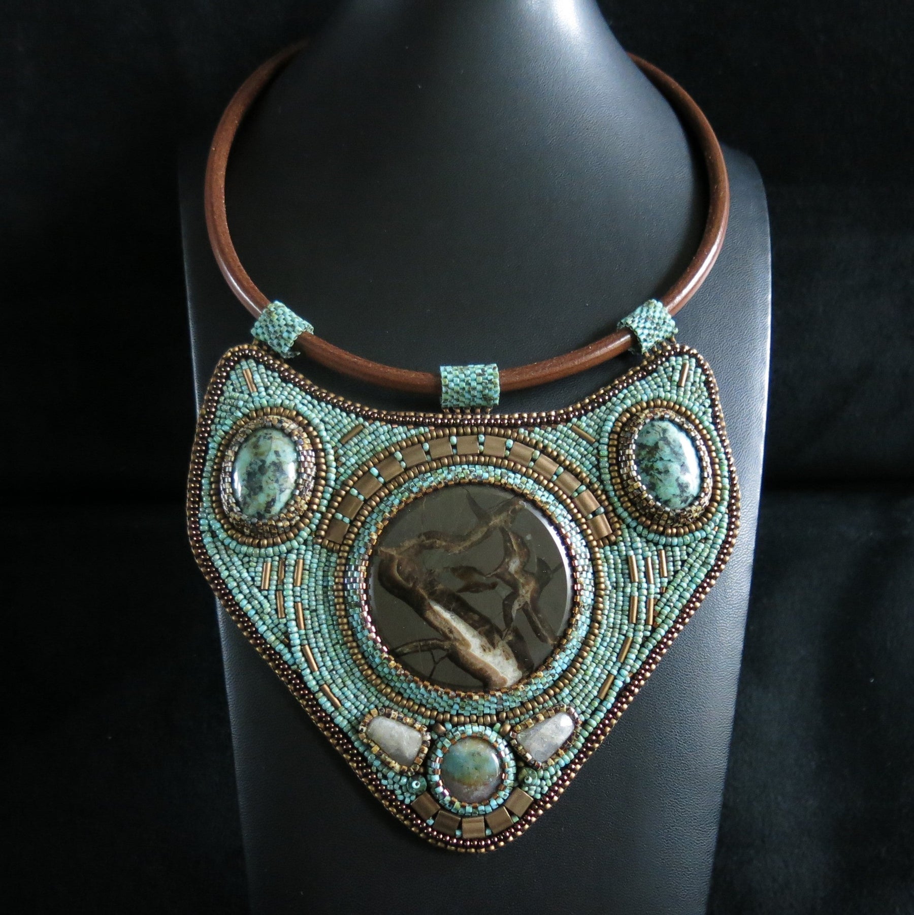 Embroidered Flower Necklace – Volcanic rhyolite, Miyuki beads