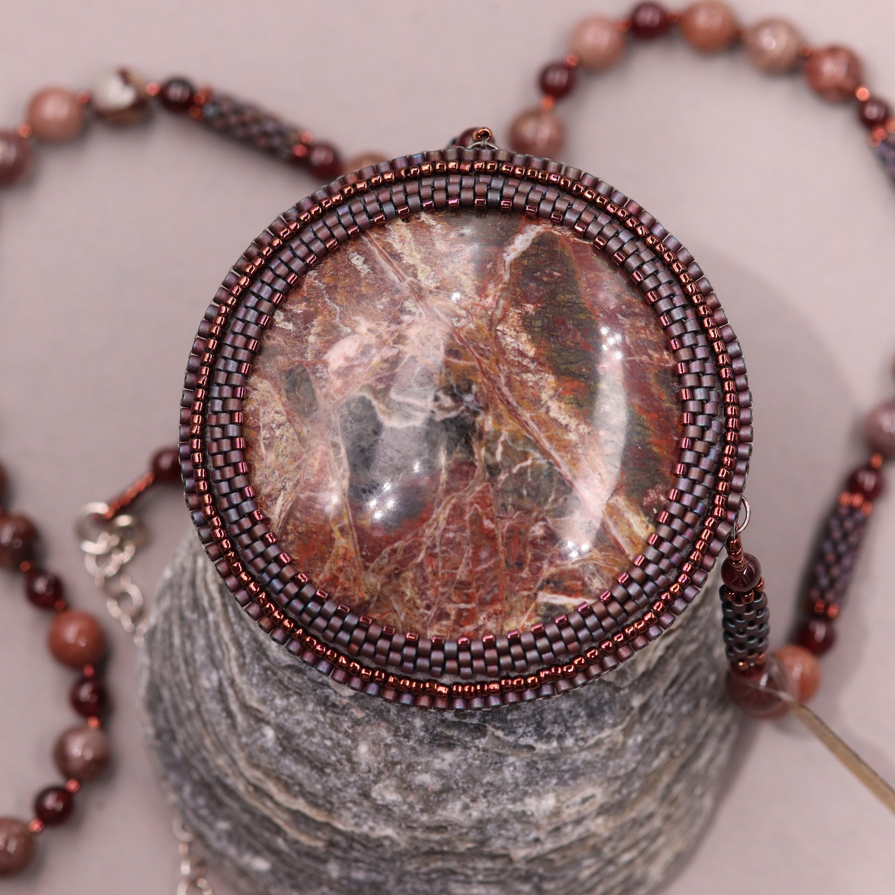 Embroidered Flower Necklace – Volcanic rhyolite, Miyuki beads