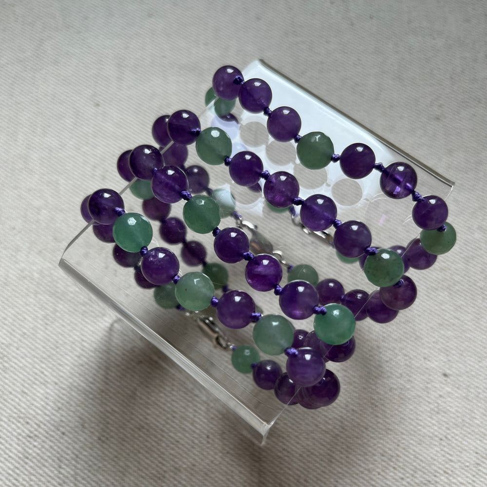 Knotted bracelet made of natural stones (amethyst, green aventurine) with a silver clasp