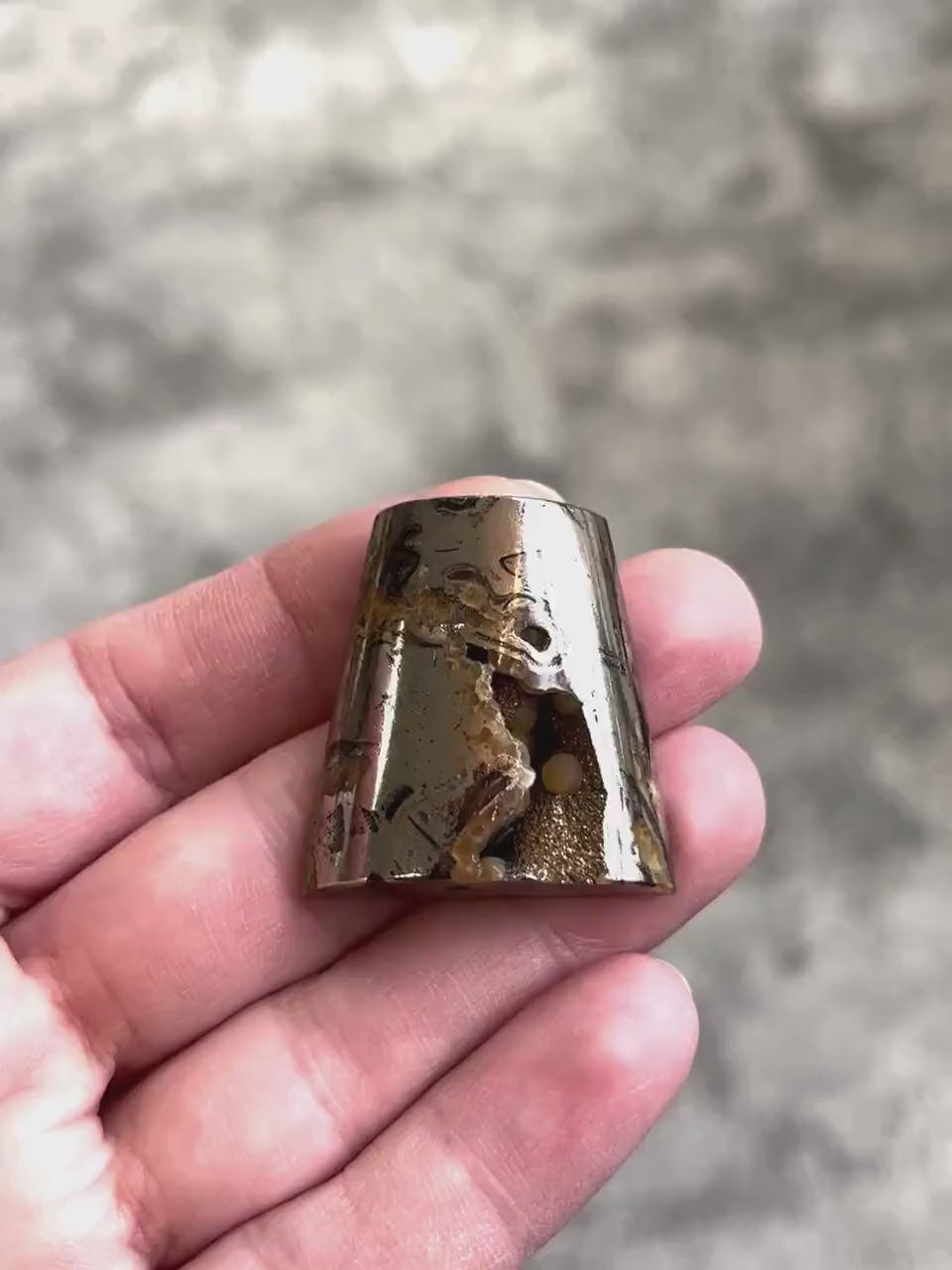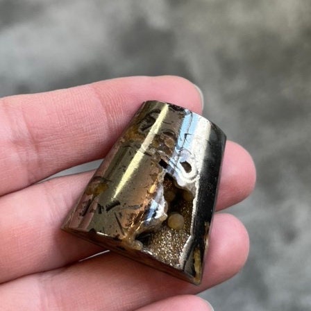 Cabochon in pyritized ammonite, geode, pseudomorph, fossil.