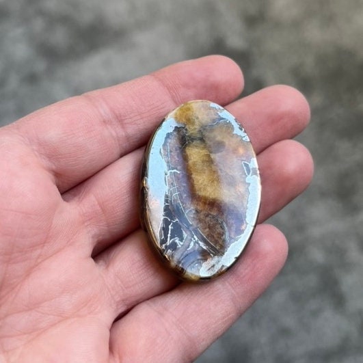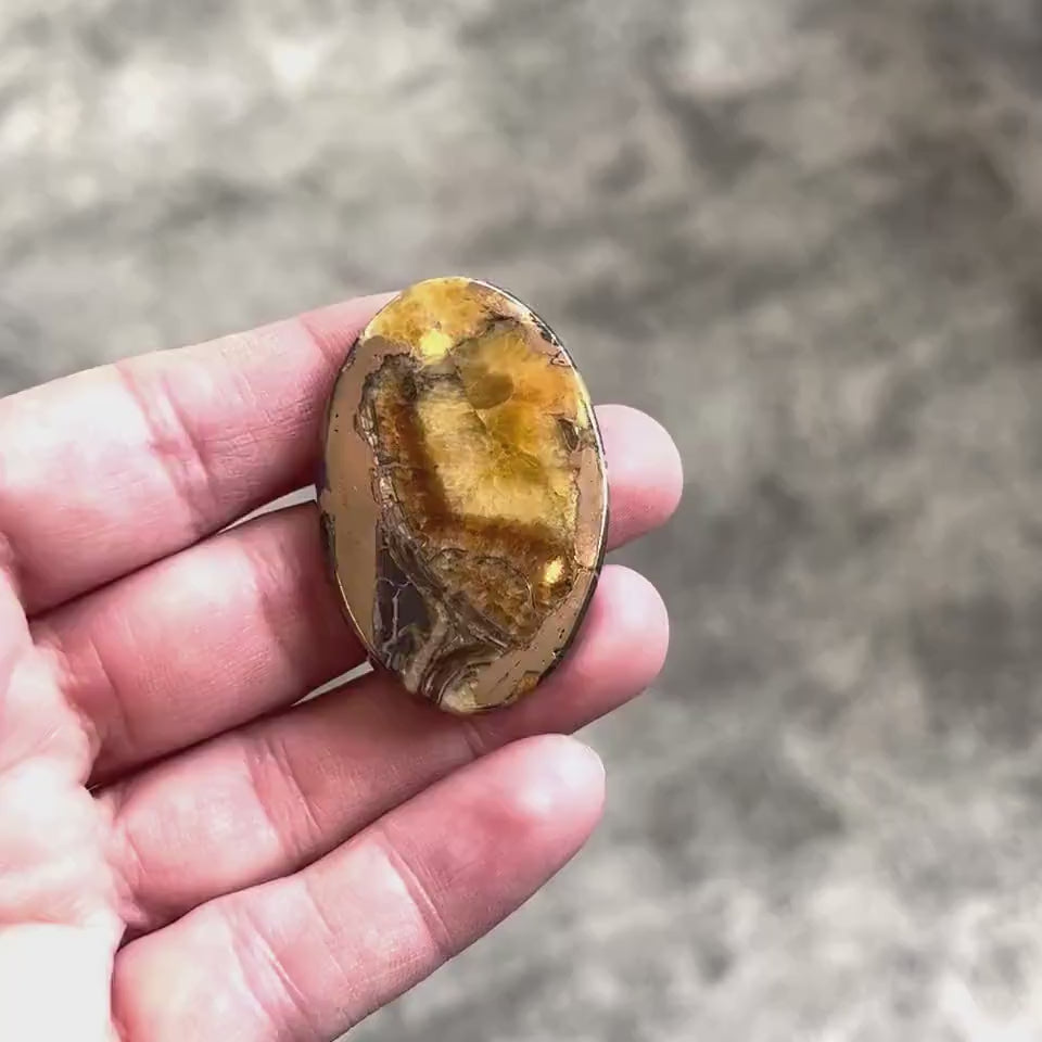 Cabochon in pyritized ammonite, geode, pseudomorph, fossil.