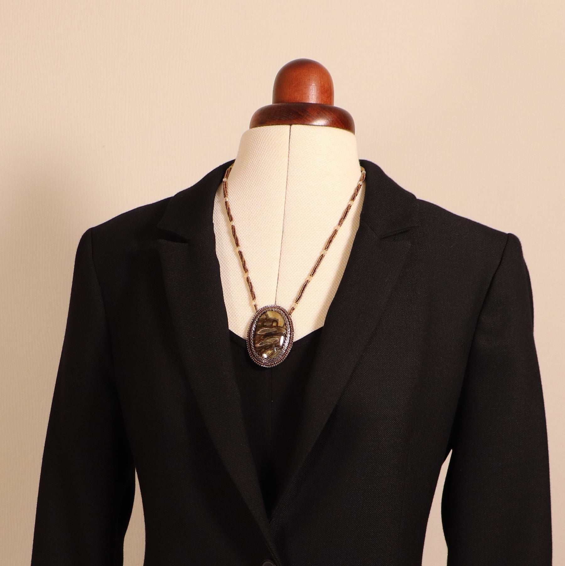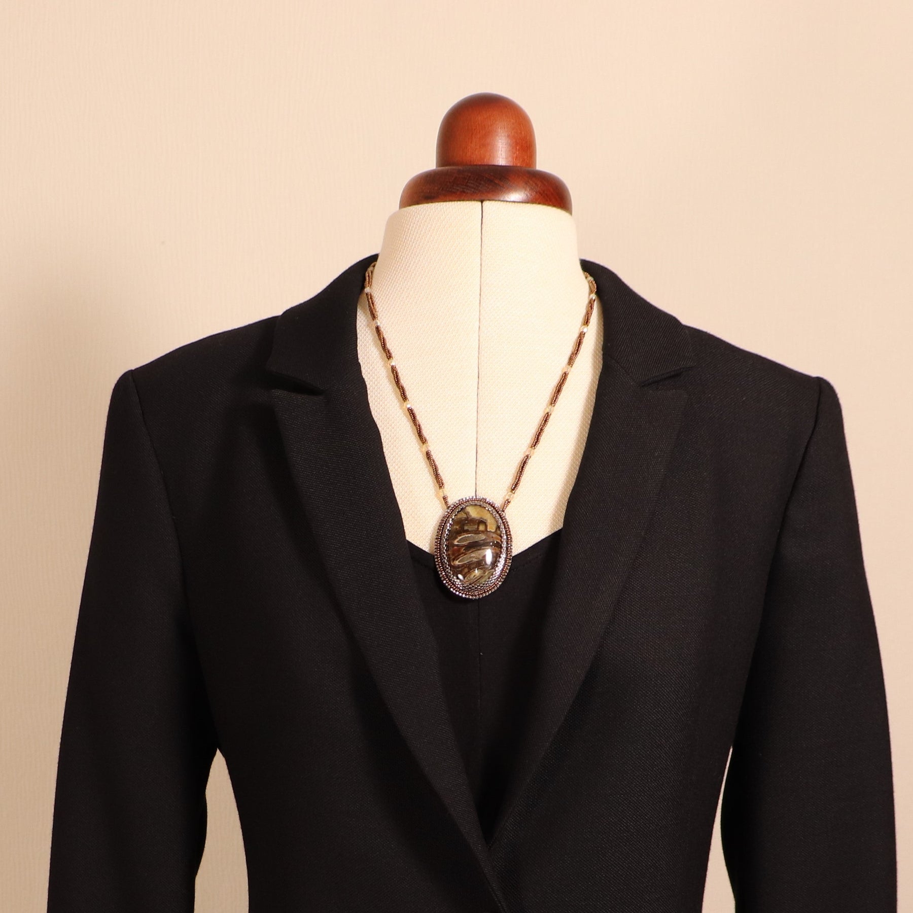 Embroidered necklace with pyritized ammonite, yellow calcite, ammolite CLB14