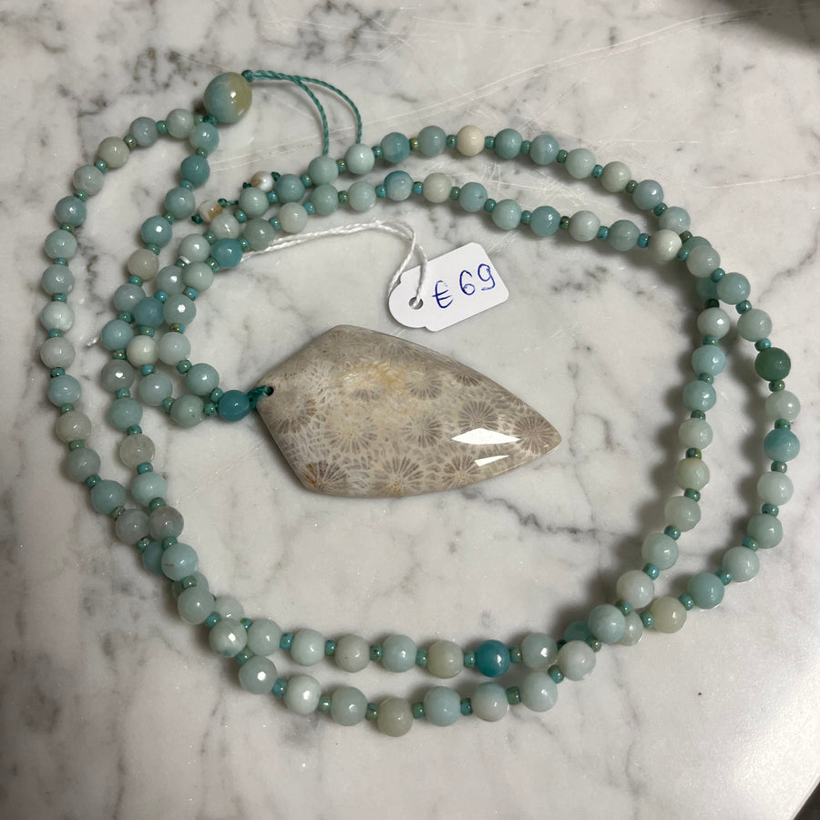 MALA necklace in amazonite and white labradorite & Pendant in fossilized coral