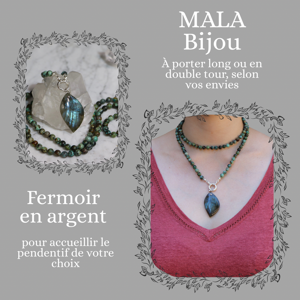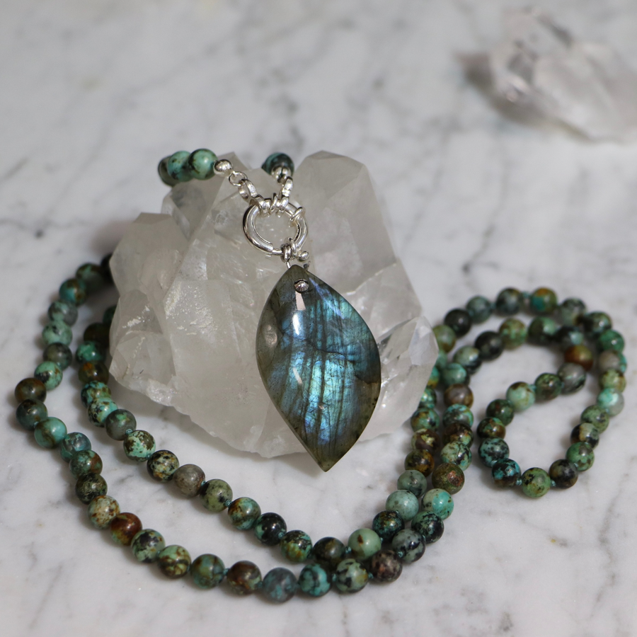Mala necklace in jasper ("African turquoise") and Labradorite pendant