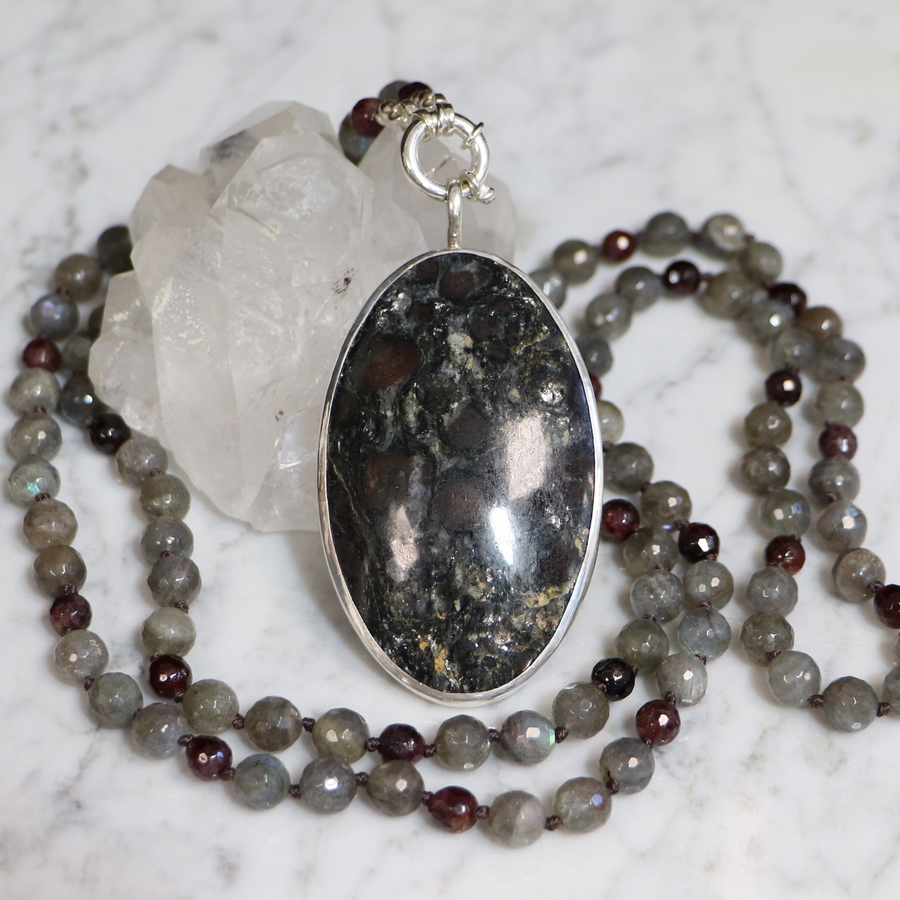Mala necklace in labradorite and garnet with mica schist pendant and garnet