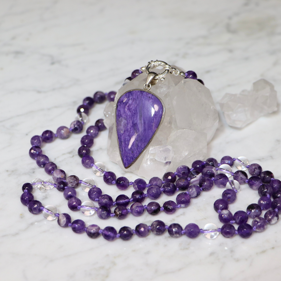 Amethyst Mala Necklace and Charoite Pendant