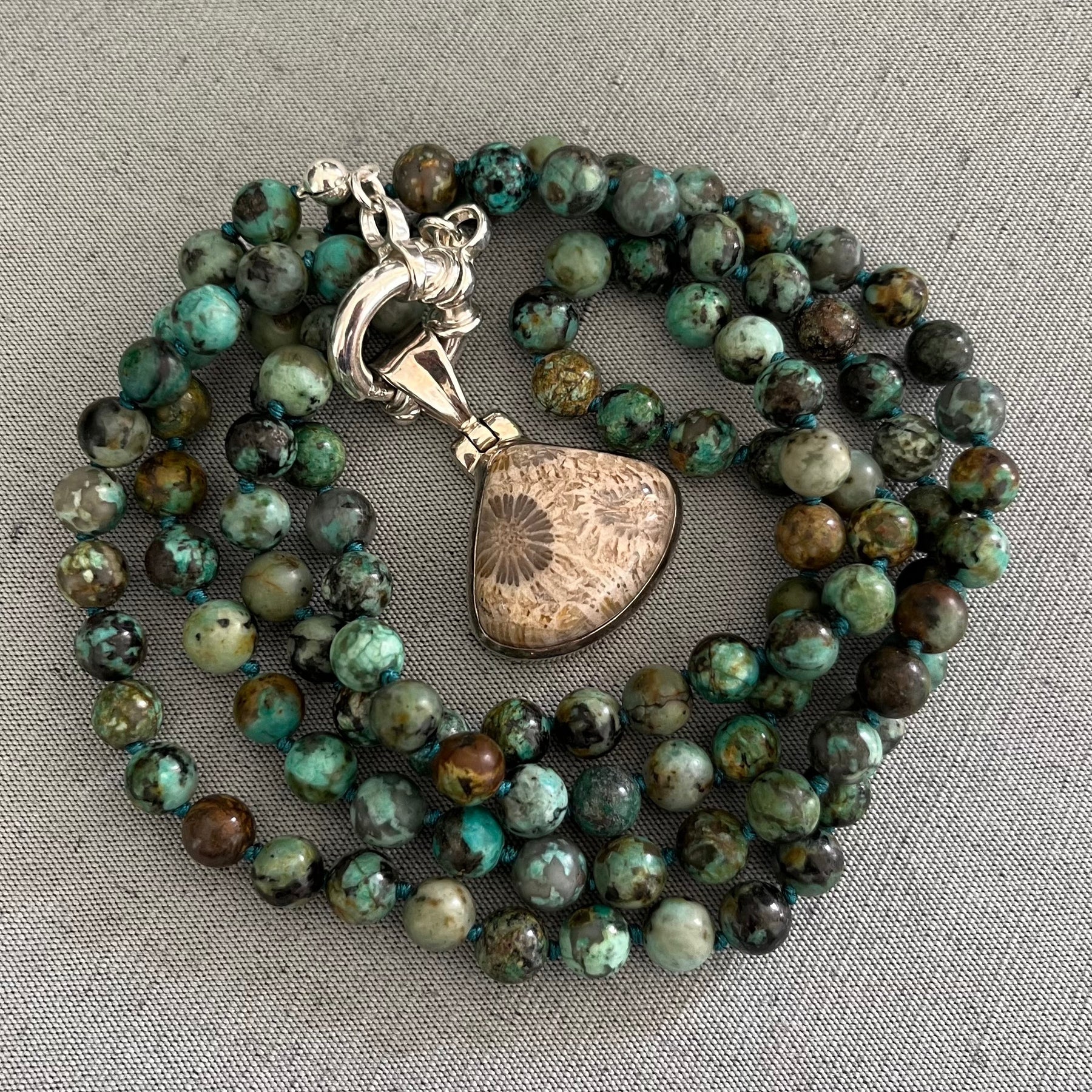Mala necklace in jasper ("African turquoise") and pendant in fossilized coral