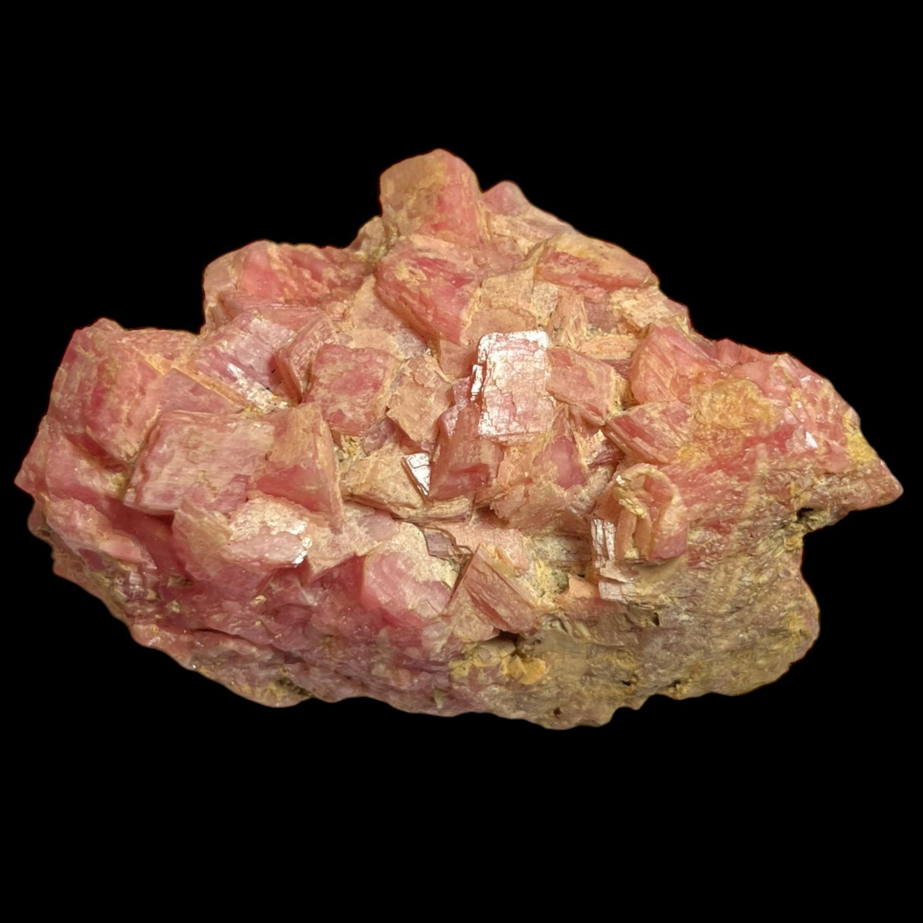 A lovely group of pink rhombohedrons, centimeter-sized up to 12mm, with some chalcopyrite crystals (from an old collection dating back to the 1980s).