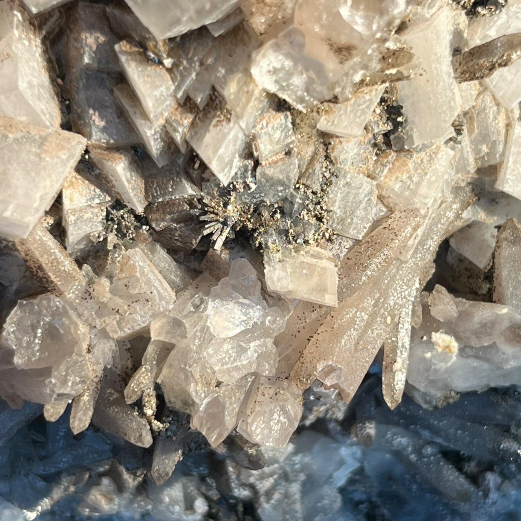Large mass of possible marmatite sphalerite covered with calcite, quartz, and galena crystals with pyrite microcrystals and metallic rhombohedral stibnite crystals?