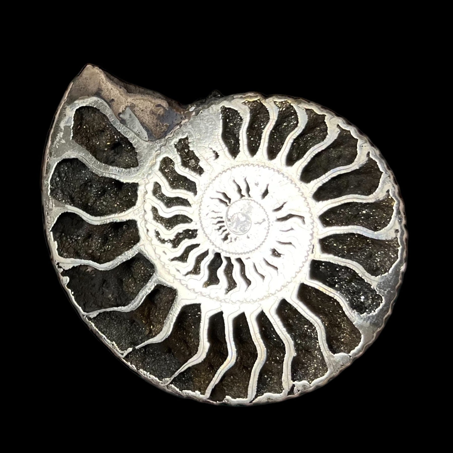 This Ammonite is sawn and polished, varnished on its back face, very beautiful crystallization inside the chambers, beautiful metallic luster.