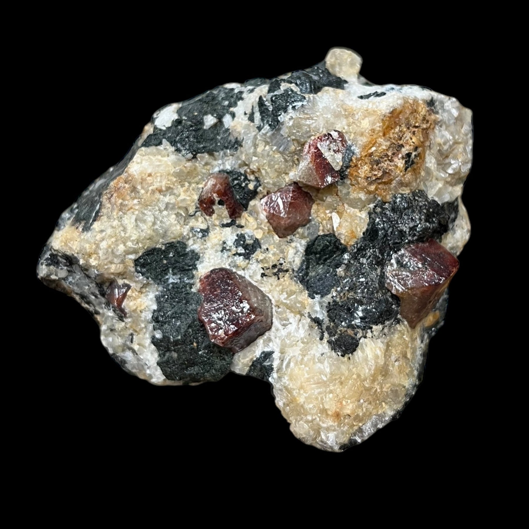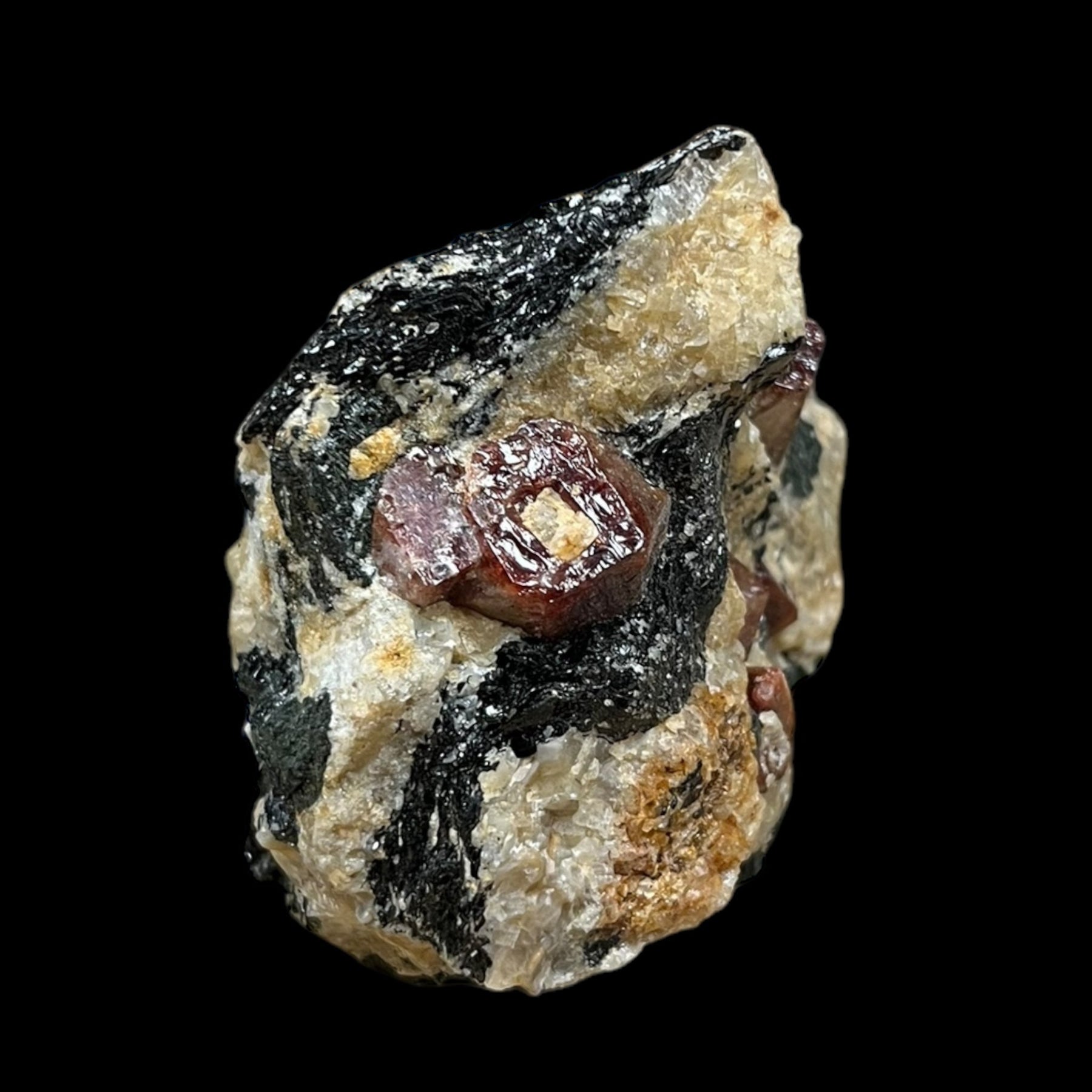 Brick-red zircon crystals on a matrix of white marble and black biotite.